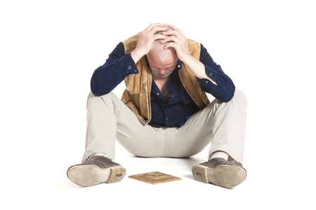 RIGA, LATVIA - JULY 10, 2017: Poor man kneeling on a sidewalk begs for money in old town of Riga.