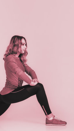 pretty healthy sportswoman practicing physical exercise on background, monochrome image with pink tint