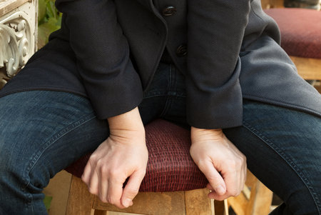 Person sitting on chair holding on seat with hands