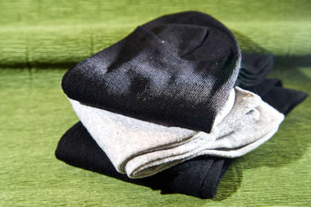 Several pairs of male socks on a green surface