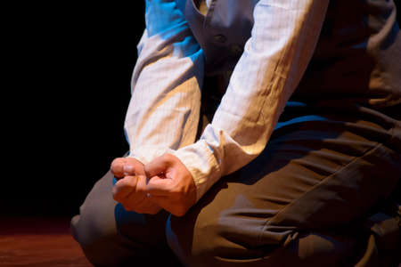 Actor representing a character on theater. He clenches his hands in pain. Sesi Theater, Salvador, Bahia, Brazil.