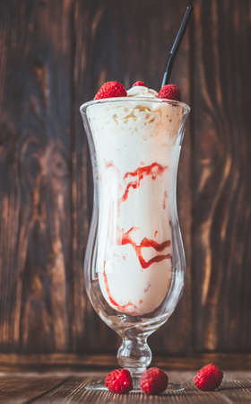 Glass of raspberry milkshake on the wooden background