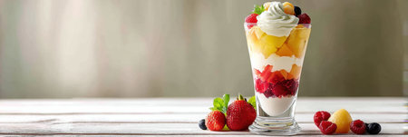 Delicious layered parfait showcasing vibrant fruit and creamy texture served in a glass, positioned on a clean white tabletop creating an inviting atmosphere.