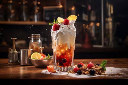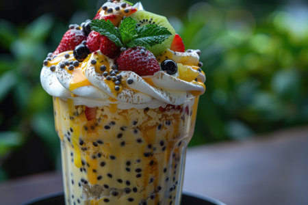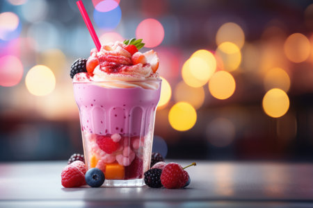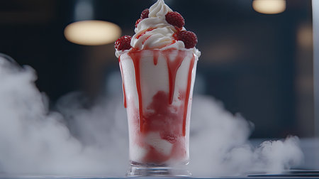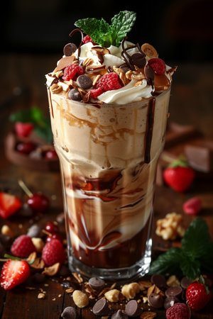 A decadent milkshake topped with whipped cream, fresh berries, edible flowers, and chocolate drizzle The vibrant colors and textures make this a delicious and visually appealing treat AI Generative