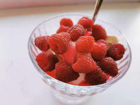 Milk yogurt with raspberries, layered yogurt with raspberry flavor and fresh berries