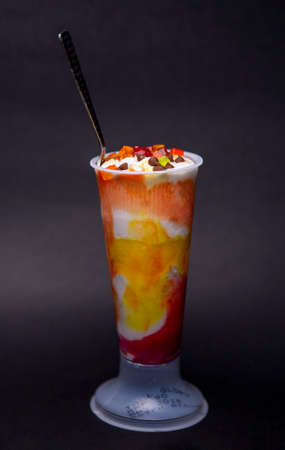 Colorful dessert with layers of ice cream, fruits, and nuts in clear glass cup on white background