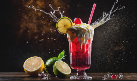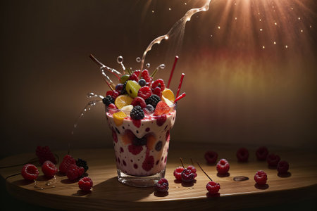 Savor the harmony of a fruit medley cocktail, featuring luscious whole fruits, succulent berries, and a swirl of yogurt a blissful symphony in a glass.