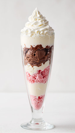 Delicious layered ice cream parfait in tall glass with vanilla chocolate strawberry scoops topped with whipped cream