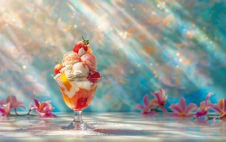 Fruit ice cream in a glass on a blue background with flowers.