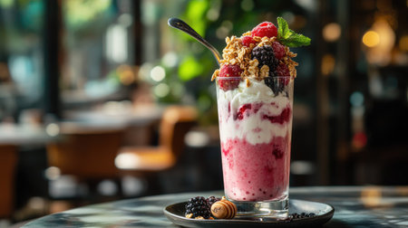 Luscious close up of a summer berry parfait layers of yogurt granola and fruits in a tall glass