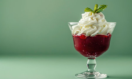 Dessert with raspberries and whipped cream in a glass on a green background
