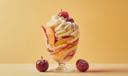 Ice cream with fruits and berries in a glass on a yellow background