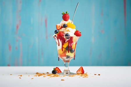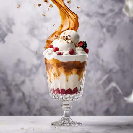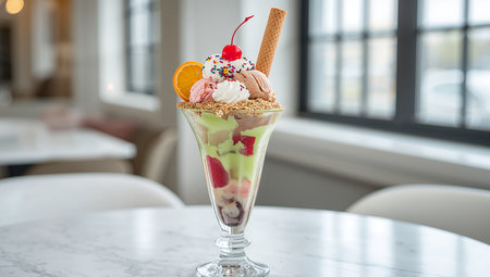 Tall ice cream sundae with layers of flavors, set on a white table in a caf.