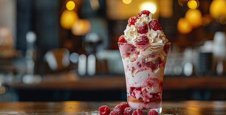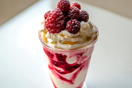Close-up shot showcasing a raspberry parfait in a glass cup. Features swirled layers of white cream and vibrant raspberry sauce, topped with whipped cream and fresh raspberries.