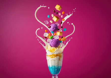 A dynamic and colorful splash of a Filipino Halo-halo dessert. Ube ice cream, jelly beans, and leche flan are splashing out of a glass with milk.