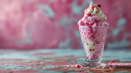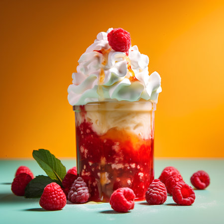 A decadent dessert with whipped cream and fresh raspberries, perfect for a summer day The pink and white color scheme is visually appealing and the image is sure to make your mouth water AI Generative