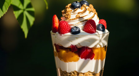 A delicious fruit parfait in a glass featuring layers of mango, berries, and cream, topped with toasted meringue and fresh berries. The dessert is presented outdoors with natural lighting and green leaves in the background.