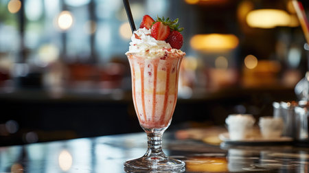 A delicious strawberry milkshake served in a classic glass, topped with whipped cream and fresh berries. Perfect for a refreshing treat anytime.