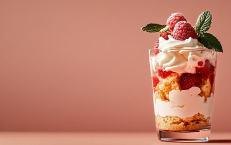 A glass filled with layers of creamy dessert, raspberries, and whipped cream is presented on a soft pink backdrop, creating an inviting and appetizing display.