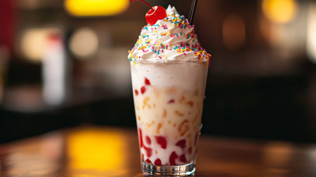 A close-up of a dessert drink topped with whipped cream, colorful sprinkles, and a cherry, served in a tall glass, highlighting the indulgence and creativity of sweet beverages.