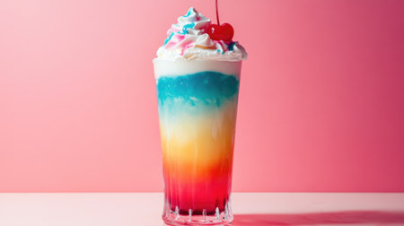 A vibrant and colorful drink with layers of blue, pink, and yellow, topped with whipped cream and a cherry, perfect for summer refreshment and social media appeal.