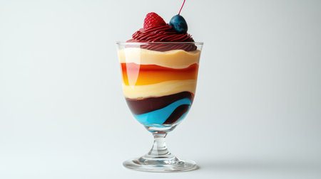 A beautifully designed glass with a colorful layered dessert, set on a plain white background, showcasing the texture and vibrant layers of the treat.