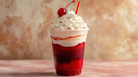 Italian soda in a plastic cup with layered red and white colors, topped with whipped cream and a cherry