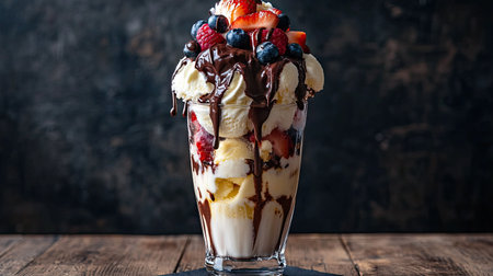 A tall glass filled with layers of ice cream, chocolate sauce, and fresh fruit, standing out beautifully against the black backdrop.