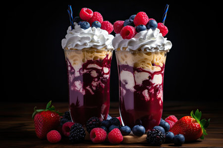 Two indulgent berry milkshakes topped with whipped cream, blueberries, and drizzled jam on a dark ba