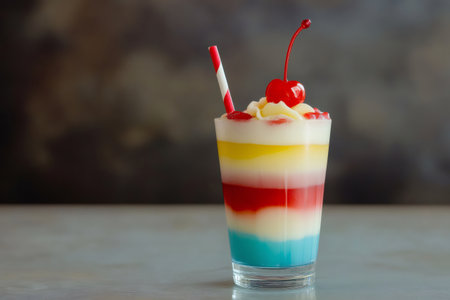 Refreshing colorful layered cocktail with straw, whipped cream and maraschino cherry, served on a gray table