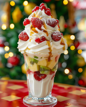 Berry and cream dessert with fruit salad and fresh juicy berries in cozy christmas atmosphere