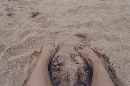 Tanned bare legs of sitting on sand female enjoying her vacation time