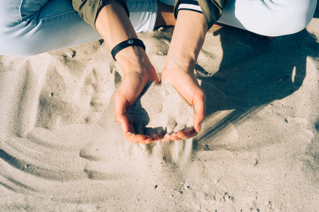 Girl sitting on the beach and the sand passes through the palm. Top view, toned image.