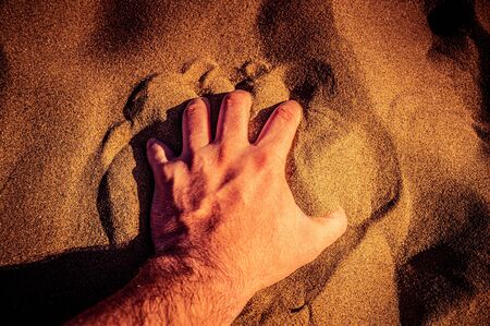 Sand spilling out pouring flow of the hand in the sandy desert dunes on bright sunny day. Transience of time. Selective focus