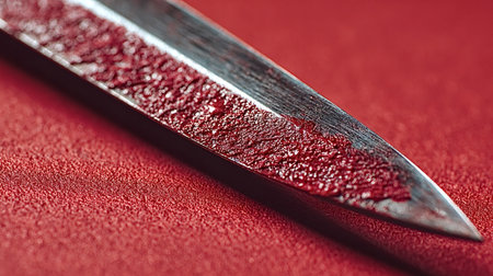 Lying on a vivid red surface, a sharp knife stained with blood creates a chilling scene, evoking unsettling themes of violence, murder, and the darker aspects of crime