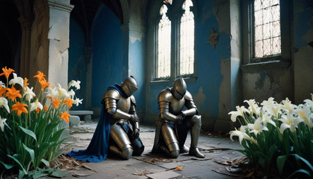 in the quiet of ruined chapel, a knight in rusted armor contemplates a single white lily