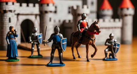 Medieval battle scene with knight and horse figures. Selective focus.