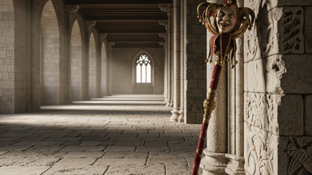Medieval knight on guard in ancient castle interior.