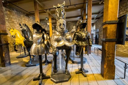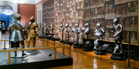 Brussels, Belgium - August 17, 2019: Armour exhibit in the gallery of The Royal Museum of the Armed Forces and Military History, famous military museum in Brussels.