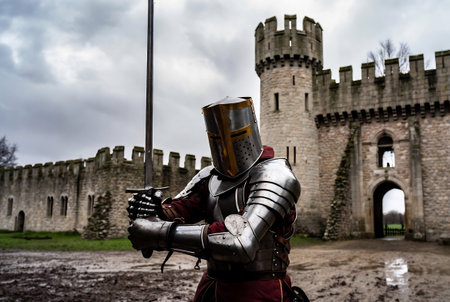 Medieval knight in full armor holding a sword standing in a historic castle courtyard