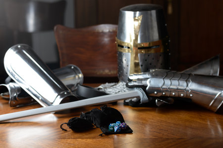 Role Playing Game and game dice and templar knight armour in the table top game epic play for RPG. ice and fire and dragons and dungeons