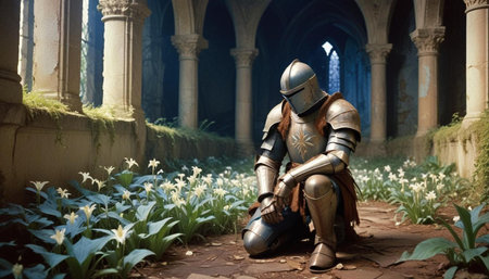 in the quiet of ruined chapel, a knight in rusted armor contemplates a single white lily