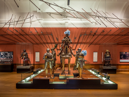GLASGOW, SCOTLAND - JULY 21: Medieval armor in the Kelvingrove Art Gallery and Museum in Glasgow Scotland United Kingdom on July 21, 2017. The Kelvingrove is an main tourist attraction in Scotland.