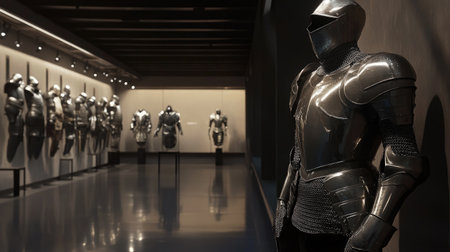 A striking view of medieval armor displayed in a dimly lit exhibition hall, showcasing the beauty and craftsmanship of ancient knightly protective gear.