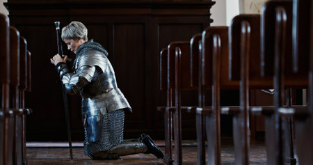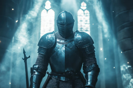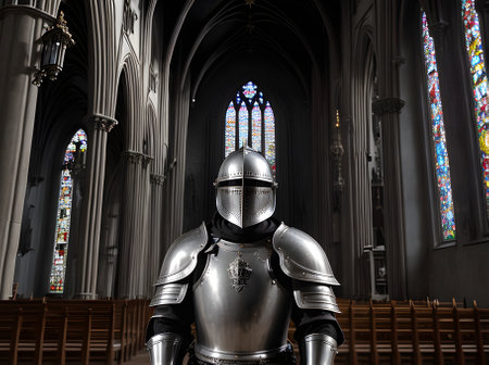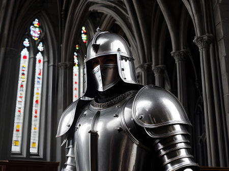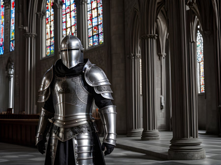 Knight in silver armor in gothic church during sunset detailed cinematic Generative AI Generated