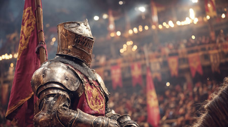 Medieval knight in battle-worn armor holding banner at tournament with crowd, representing historical reenactment and warrior tradition.