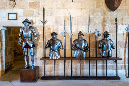 Set of Medieval Pikes Exposed with Limestone Background of Castle wall and Armor