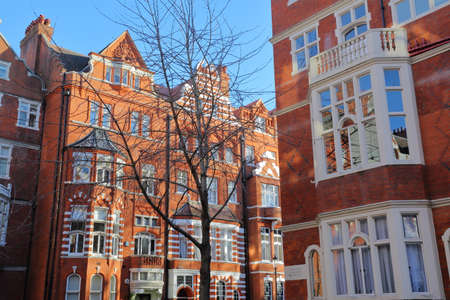 LONDON, UK - NOVEMBER 28, 2016: Red brick Victorian houses facades in the borough of Kensington and Chelsea
