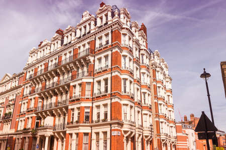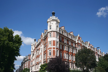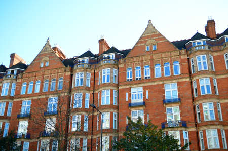 London/UK-30/7/18: Large late Victorian blocks of mansion flats. British houses are the form of medium-density housing that originated in Europe, whereby a row of attached dwellings share sidewalls