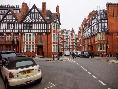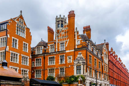 LONDON, UNITED KINGDOM - MARCH 8, 2019: Wide view of the Victorian era red brick gabled houses and buildings along Pont Street, Knightsbridge, on a cloudy day. Travel and tourism.